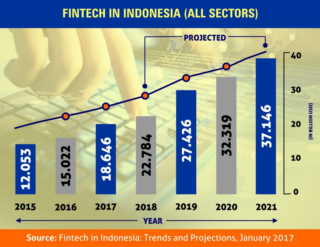 Fintech in Indonesia is an untapped market opportunity. The vast geography of the lands, considerable middle-class growth and poor penetration of financial products altogether combine to create a formidable market for the development of fintech in Indonesia. With only 36% of the population having a bank account, fintech in Indonesia holds the promise of delivering accessible financial services to the underbanked population in the country. It is noteworthy to highlight that platforms of fintech in Indonesia grow by leaps and bounds from year 2015 to end of 2017. Through this period, the number of fintech platforms escalated to reach a total value of USD 18.646 billion as at end of 2017.Moving forward, fintech (all sectors) are projected to be valued at USD 37.146 billion by 2021.